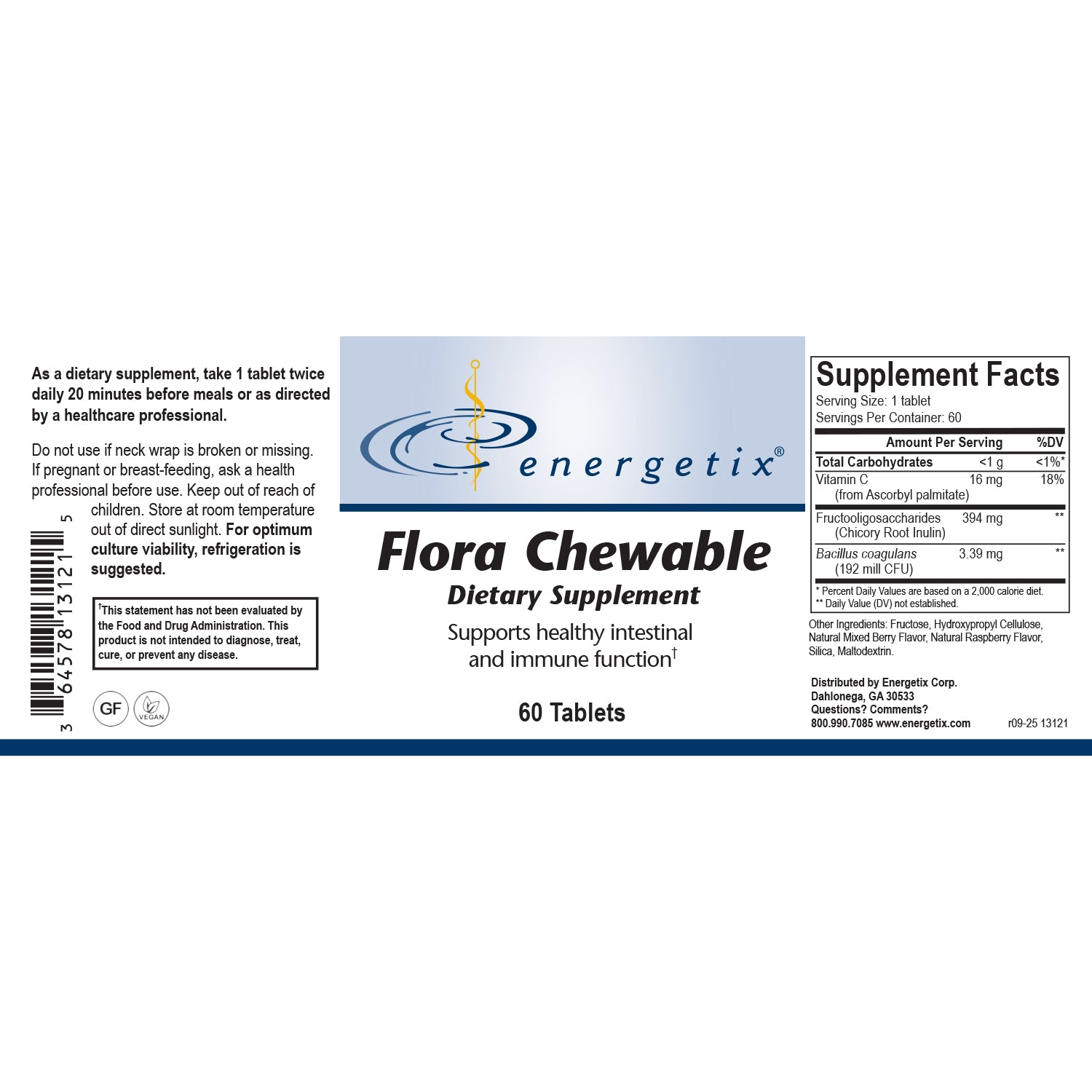 Flora Chewable contains the spore form probiotic Bacillus coagulans and prebiotic fructooligosaccharides (FOS) to help support normal immune and digestive response. Bacillus coagulans—a lactic acid-producing bacterial endospore nourished by the FOS—aids in maintaining normal intestinal microflora balance.