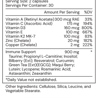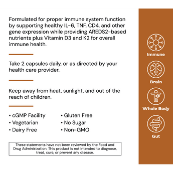 Formulated for proper immune system function by supporting healthy IL-6, TNF, CD4, and other gene expression while providing AREDS2-based nutrients plus vitamin D3 and K2 for overall immune health.